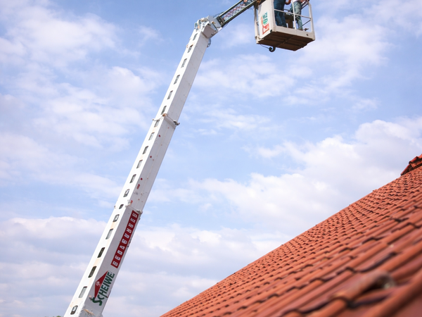 Effiziente und sichere Arbeiten in großer Höhe mit Autokran und Raupenarbeitsbühne. Scheiwe Bedachungen bietet moderne Technik für Dach- und Fassadenprojekte in Warendorf, Münster ...